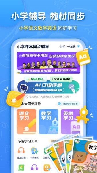 涵盖小学语文、小学数学、小学英语全科知识点,配套拍照搜题、英语口语测评/口语练习、语文听课文、英语听课文、同步识字、字词听写、单词听写、同步学单词、速算口算、竖式练习、速算校对、单位换算、各科同步课后练习、作文库、古诗文库、汉语/英语辞典、双语互译……等20多个智能学科专项工具,海量题库习题量,随时随地学习练习;