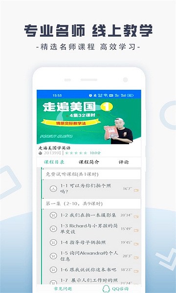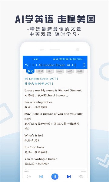 1、首页主要通过播放原文、注释、练习、跟读和评论等方式教会用户如何以《走遍美国》来学习并帮忙加深理解。