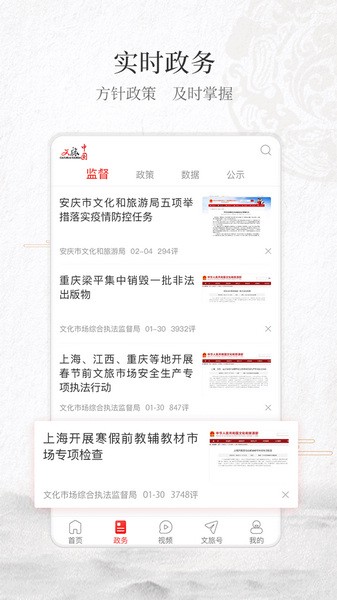 2、“政务”版块主要包括监督、政策、数据、公示、部门等栏目,着力打造文化系统和文化行业内最权威、最专业的移动政务信息发布平台。