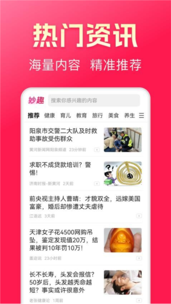 妙趣极速版客户端是一款集视频播放、资讯浏览、娱乐刷视频功能于一身的应用软件。该平台提供了丰富的视频内容,包括热门资讯、短视频、短剧等,每天都有大量新视频更新。用户可以关注喜欢的视频账号,随时了解最新动态。此外,妙趣极速版客户端还涵盖了各种生活、健康、育儿、教育、美食、旅游、养生等领域的热门资讯,确保每位用户都能找到感兴趣的内容。