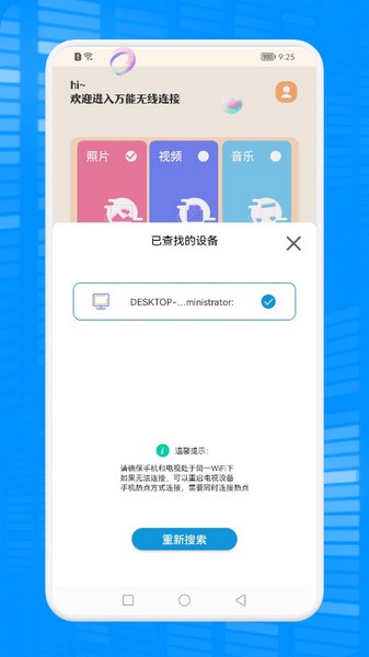 万能连接无线app是一款超级方便的投屏软件,主要是用来把手机里的内容传到大屏幕上显示,像视频、图片、音频什么的都能投屏播放。操作特别简单,只要在同一个WiFi环境下,连上设备就能快速开始投屏,完全不用费劲儿搞设置。
