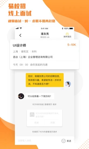 2、面试时间在线协商,沟通无障碍、在线面试,省时省力、offer在线收取,方便查看