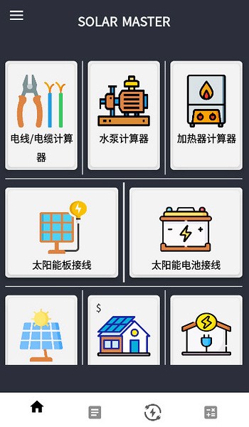 solar master免广告版也可以叫做太阳能大师,,它是一款非常好用的计算机软件,软件内包含了许多与太阳能与电力系统的计算器,通过该软件用户们可以非常轻松的计算电线电缆,水泵加热器等设施的相关数据,比如所需的太阳能电池板和电池的数量、逆变器/UPS和控制器充电器的尺寸等等,软件已经修改去除了广告,让用户们使用起来可以更加方便。