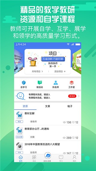 3、同时提供精品的教学教研资源和课程,教师可开展自学、互学、展学领学的优质学习空间。