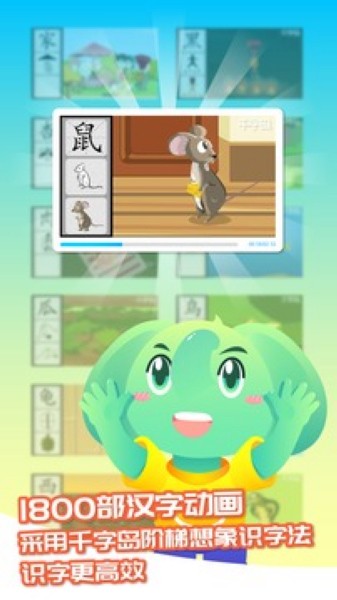 3、1800部汉字动画,采用千字岛阶梯想象识字法,音形义高度统一,识字更高效。