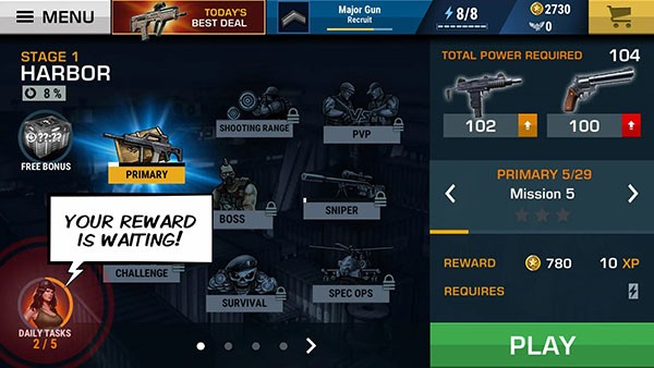 3、BOSS关卡和特种任务模式奖励都特别丰富,难度相当的大,只有具备高超的射击技术的天才才能通过