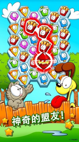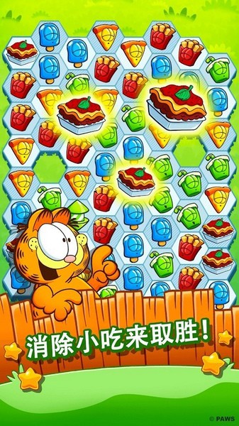 游戏中引入了十分新颖的消除玩法,玩家在加菲的世界中将探索超过1200个关卡;