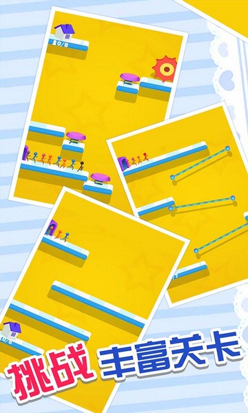 3、火柴人快溜帮助这些火柴人从绝境中溜出去。只需要滑动屏幕就能画出线了,当然这个道路要尽量平稳安全。
