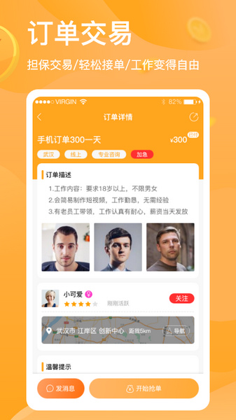 4、订单交易:订单在线担保交易,在线沟通轻松接单,让工作变得自由。