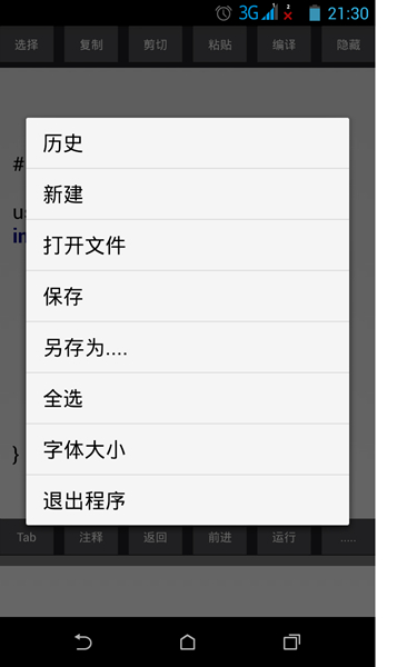 界面简单清新,增加了历史列表,支持输入语句的操作。在这里,我们能够方便地验证一些小程序,代码的常用功能如Tab和注释也得到了良好支持。更为重要的是,这款手机版编译器支持直接从文件管理器中打开代码文件,为程序编写提供了极大的便利。手机已经阻止不了我们编程,有了这款软件,我们能够随时在手机上解决疑惑,编写脑海中突然涌现的代码。