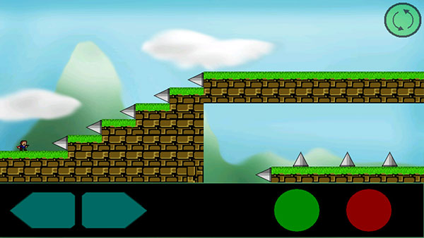 2、使用左边两个按钮控制角色左右移动,点击绿色按钮进行跳跃、红色按钮进行发射子弹。