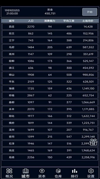 土地均价:每平土地的价格,开局城市最低土地5平,最高10平,08年大都市最高20平,每平价格过亿(在这里我要控诉某游戏开发者,最后一个城所有的地皮我计算了一下,需要7万亿左右才可以把地皮全买下,简直残暴)