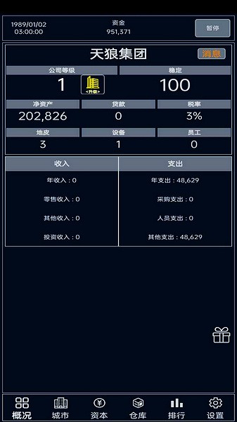 6、公司等级:游戏初始1级(三块地皮上限)后续用资金升级会增加地皮上限(同时增加公司的税率——影响销售的产品的利润)即升1级=3块地皮最大上限,例:9级=27块地皮上限。(这个版本可以称之为地狱难度,原因在于升一级才有三块地皮上限,我升级到55级用了10000亿,贫穷使我质壁分离)
