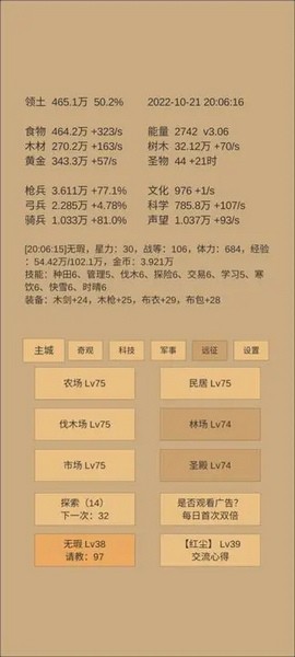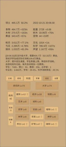 4.军事:加战力,减少负伤。前期收益就很好。当文化快达到每秒加15的时候,攒科技将军事升到20。(博物馆+兵事堂效益一骑绝尘)。
