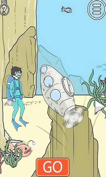 9、点击GO,去第二页,回到第一页,点击中间的草,原来是章鱼,章鱼下边是铁锹,得到铁锹,挖地上的大罐子,里边有螃蟹,得到眼镜回到第二页,眼镜给雕像。