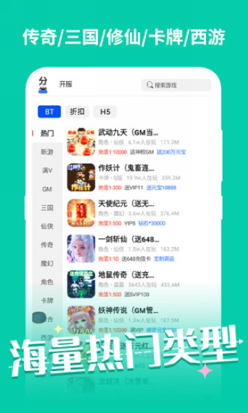 云上游戏是一款收罗众多变态游戏资源的游戏盒子类应用软件。玩家用户可以在这款软件中找到许多当前热门游戏的变态版本,经过大幅度修改后给玩家带来完全不一样的游戏体验。各种游戏类型,卡牌、仙侠、策略...应有尽有,更有多款H5游戏可供下载。此外,玩家还可以通过这个平台来为下载的变态游戏进行充值,享受超高折扣。