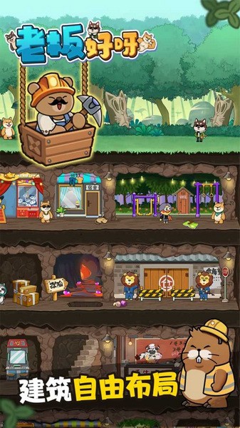 老板好呀游戏是一款卡通风格的经营类游戏,玩家可以成为老板,带领员工建设地下洞穴。游戏中有很多可爱的动物伙伴,比如熊管家,还有各种有趣的探险内容,比如挖宝、探索未知的洞穴,甚至可能遇到宝箱。你可以招募性格迥异的员工,让他们帮忙建造各种设施,比如“猫猫996”或者“鱼人武馆”,还可以自己做菜,开发新菜品,让地下王国变得更热闹。