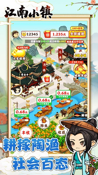 江南小镇的游戏玩法如同清风拂面,简洁而有趣。轻触一键,耕耘、养殖、收获,整个过程自然流畅。每一次操作,皆是订单的完成,现金红包的获得。然而,种植和养殖之外,小船订单、酒楼生意、角色馈赠等,皆为你创造赚取现金红包的机会。而离线收益,亦恭候你的领取。在游戏的世界里,你将不仅是小镇的主宰,更是赚钱的智慧领航者。种植的物品可供出售,余下则储存入库。最为卓越的模拟商务体验,由此探索。各类订单静候填写,每一笔生意皆是财富的积累。种植,是你的起点,每日务必照料。福利多多,时刻等待,只需上线,即能轻松领取。温馨的场景,渐次为你敞开,每一处装饰,皆是小院的彩绘。