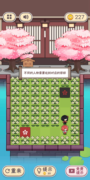 在地图中自由移动,按照关卡任务来操作,将小女孩顺利的移动到有樱花图案的格子上;