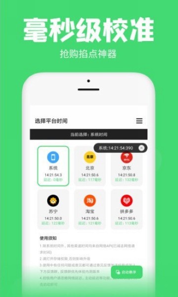 包含北京时间、京东时间、苏宁易购时间、淘宝时间、拼多多时间多个渠道服务器时间校准,让你的整点抢购更精确!