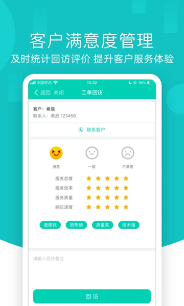-- 客户满意度管理,及时统计回访评价,提升客户服务体验