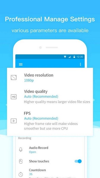 超级录屏大师提供多项专业参数设置,实现高清流畅录屏,同时超级录屏会自动根据当前手机硬件配置,设置最适合的参数!