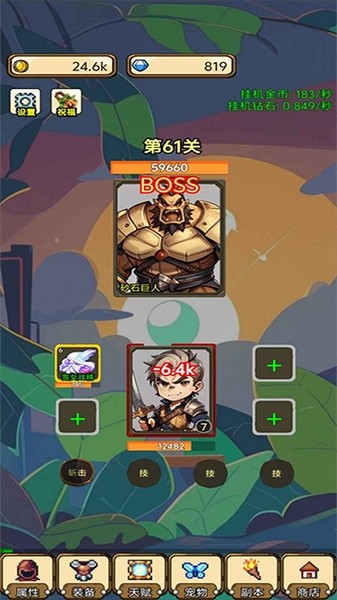 提升战力的方式也很多样,可以用金币升级属性,召唤装备和宠物,或者通过技能点强化战斗能力。玩家可以在各种关卡中自由探索,完成任务获取资源,体验沉浸式的游戏世界。如果你喜欢独自挑战的刺激感和不断提升的力量,《一个人的战斗》绝对值得一试!我个人觉得这是一款能让人欲罢不能的游戏,特别适合喜欢策略和操作感的玩家。