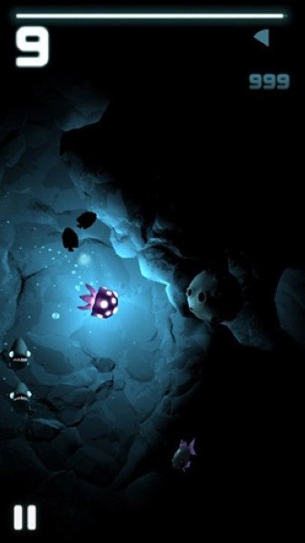 水母移动是肯定需要能量的,在上方有一条白色的线,这就是能量。这个能量会慢慢的减少,如果能量消耗完了的话,就游戏结束死了。想增加能量,有几个方法,那就是吃掉会发光的小鱼,如图所示。