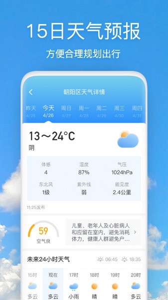 2.掌握未来15天的天气状况,预测雨、晴、冷、暖,为生活早作计划。