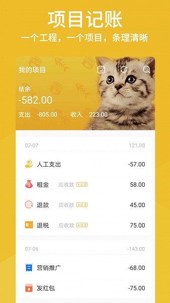 您可以选择以项目为中心来管理账务,一个工程一个项目,每个项目账目独立,轻松查看每个项目收支结余。