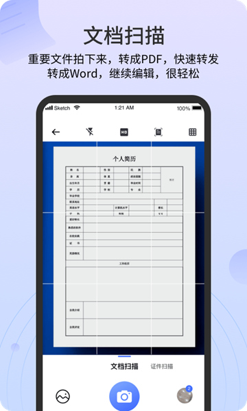 手机拍文档,自动去除杂乱背景,生成高清JPEG图片或PDF文件。