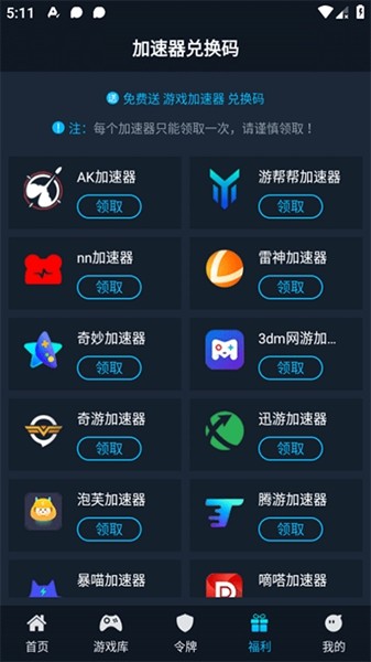 3、在福利界面可以免费领取雷神,炽焰,野豹,AK等加速器VIP会员