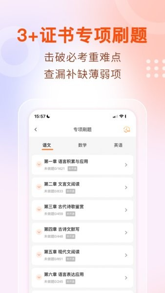 每日打卡: 系统智能选题提供语数英三科练习题,帮助用户明晰遗漏考点,巩固基础。