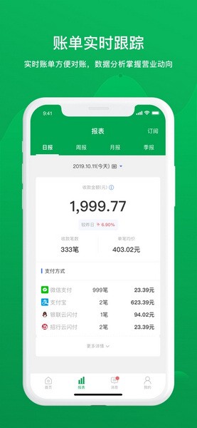 1、【收款】商户可快速开通多种移动支付收单方式,支持消费者扫码支付、刷卡支付,收款便捷;