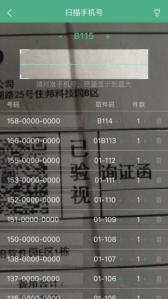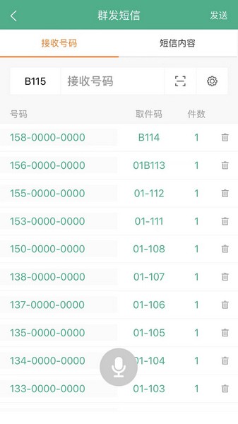 3、首先需要设置接收的号码,你可以选择手动输入,也可以选择语言输入,同时软件还支持扫码录入,只需扫描面单就可以获取收件人手机号码。