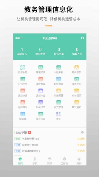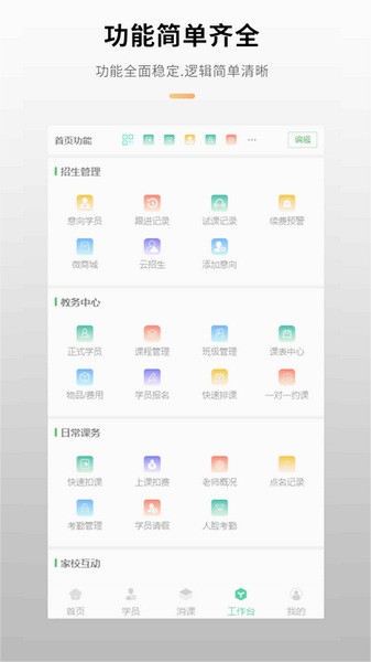 潜在学员管理、正式学员管理、上课点名、扣课消课、布置作业、课表管理、请假审批、学员档案管理、续费预警管理、业绩管理、欠费订单跟进管理等等...