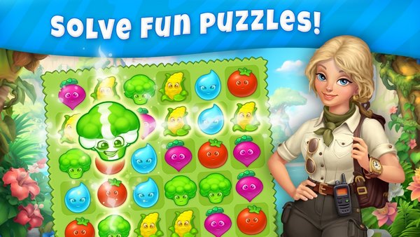 游戏特色鲜明:丛林深处的侦探故事、每棵棕榈树背后的谜语、连续三个 juicy vegetables 的消除玩法(没有传统的宝石、珠宝或饼干元素)。画面精美,角色独特,还有离线三消功能,随时随地都能畅玩。破解版让金币无限使用,道具随意购买,这让玩家可以更轻松地体验游戏。