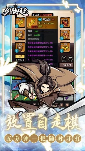 剑侠风云最新版本安卓版是一款 国风武侠自走棋类型的策略游戏。在这款游戏中玩家可以召集许多侠客角色,这些角色来自不同的武侠故事,许多耳熟能详的角色将会在游戏中登场,并且游戏根据他们各自的故事设计了羁绊机制,当玩家凑齐羁绊所需要的角色后一齐上阵就可以激活羁绊效果,为角色提供强力的加成,让角色能够发挥出更强大的力量。羁绊除了与同故事的角色有关联外还可以根据职业、门派来生成,这可以让玩家在搭配阵容时不局限于一种搭配方法,更加地灵活,可以看到不同故事的角色跨界联动生效羁绊。此外,玩家还可以为角色装备武功秘籍,根据角色的特性来选择合适的武功装备,还可以通过打怪来获取其他的装备,这样为角色提供的加成就有很多了,角色也会越来越强。