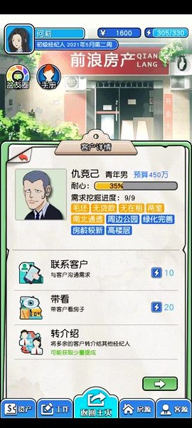 第六,顾客:不是所有顾客都是你攻略对象,你前期主攻一房,还是二房,还是三房以上!你必须专精其中一个,屯其中一个,大量A房和S房!如果不是你专精的顾客,10体力你就知道是否你专精房子顾客,不是就转手其他经纪人,懂得分享,及时止损。