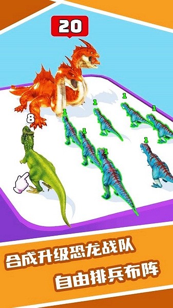 1、为了赢得这场战斗,你需要使用你的策略来在你的战场上合并恐龙,不断的升级。