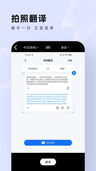 配备强大的摄像头取词和拍照翻译功能,一拍即译无需手动输入便可快速获取翻译结果;