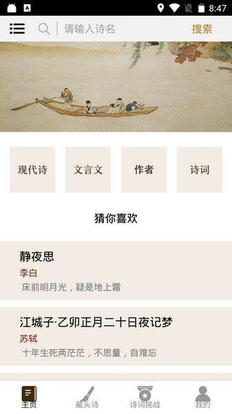 2、分类推荐:主题分类:离别、咏史、咏物、思乡、感悟;还有情怀、节日、现代诗、文言文、作者、诗词多种分类,快速查找需要的诗词、古文、唐诗宋词