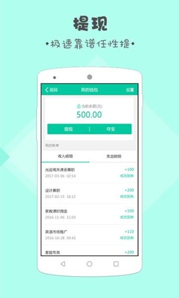 用这个App,每天签到打卡也很简单,还有各种活动消息提醒,随时掌握兼职动态,不会有错过的机会。最棒的是提现功能,特别快,完全不用担心钱的问题。