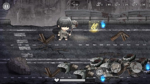 总体来说,游戏的难度并不是很大,左侧移动,右侧依次武器切换、武器攻击和钢管攻击一览无遗,但由于武器攻击受子弹限制,可以在关卡的障碍中获取,切记要注意下方的血条,这是人物生存的基准。