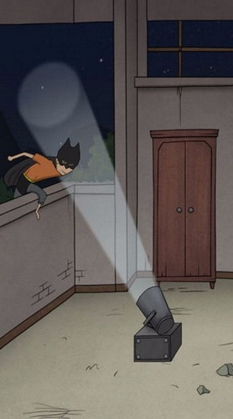 3.第二页,大衣柜里得到板凳,第一页,板凳放在日历下边,站上去,撕日历两次,出现蝙蝠侠标志,继续撕,撕光光,出现扳手,第二页,扳手打开探照灯下边的盒子,得到竹鼠