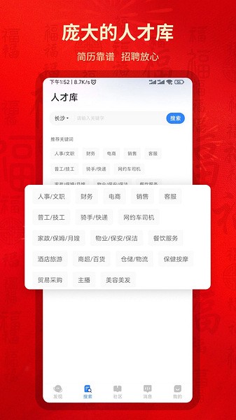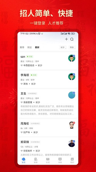7、求职者与招聘者高度匹配,快速查看,长沙直聘设有企业屏蔽功能,完全保障你的个人隐私!严格的职位审核机制,对虚假信息零容忍! Boss直接招聘、在线拿Offer、实时更新名企专场招聘会,通往名企的直通车。