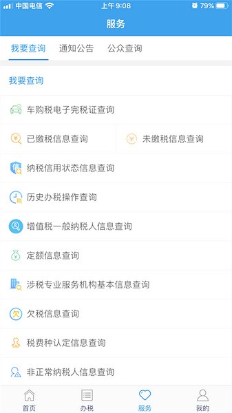 1、公众服务:包括:通知公告、征期日历、发票验真、法律法规、办税流程、办税地址、12366服务、征纳互动、欠税公告、地税微博、地税微信等服务功能。