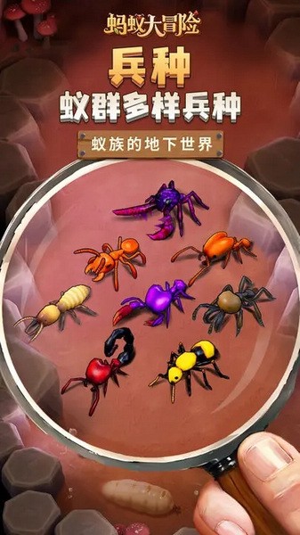 蚂蚁大冒险是一款以蚂蚁为主视角的策略冒险游戏。在这款游戏中玩家将作为蚂蚁部落的指挥官带领蚁群开辟领地,扩张蚁群的规模,收集足够的食物来孵化新成员。同时玩家还要培养各种功能的蚂蚁来服务整个蚁群,对抗那些怀有敌意的昆虫,合力击败它们并将它们的尸体变成养料来培养特种蚂蚁,还能够召唤部分被击败的昆虫来并肩作战。