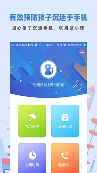 3、提醒各位家长:引导孩子健康上网,沟通和约定是首要的,蓝小咪会帮助您达成目标,希望您和 孩子使用愉快,养成良好的自律习惯!