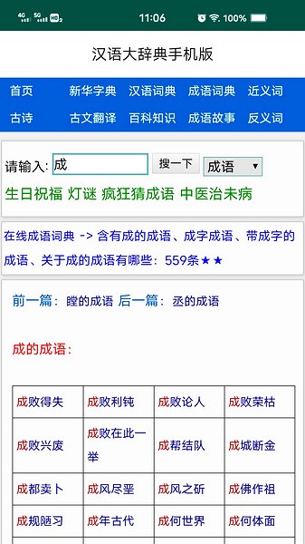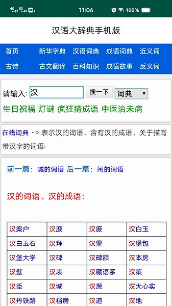 汉语大辞典是一款专业实用、操作简单的词典工具软件。《汉语大辞典 App》可查成语5万条、汉字20973个、词语384925条、诗词93535首、灯谜41090条、对联5399幅、 近义词反义词别名各1000余组、各级教材文言、译文等。在网络时代,适合大数据应用,高效便捷。